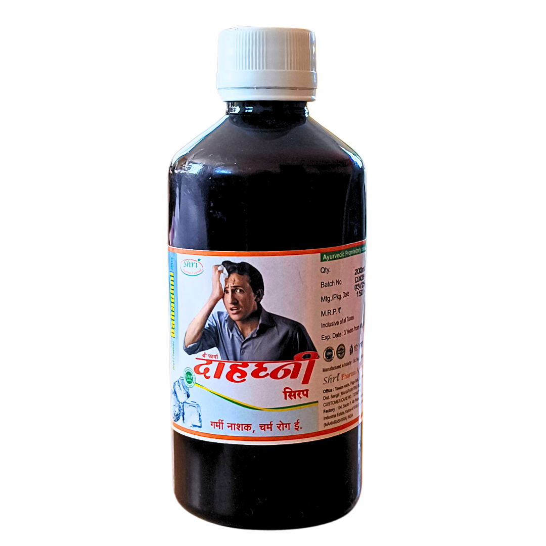 Dahaghani Syrup is a natural Ayurvedic formulation prepared using cooling and detoxifying herbs that help balance internal body heat and support overall wellness. It helps reduce excess heat, supports liver function, and assists in managing skin issues caused by heat imbalance.